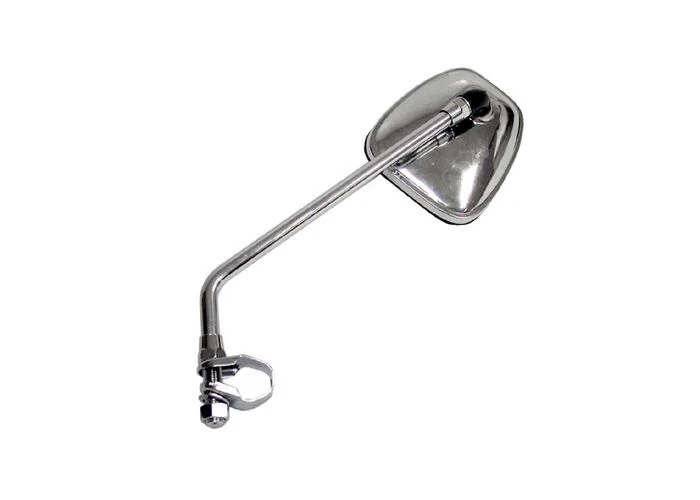 Unlike a bar-end mirror that mounts on the end of the handlebar, this design uses a clamp that will attach inboard of the grips. Left or right side; it doesn’t matter. This gives the mirror a pretty much universal fitment. The ball socket allows you to position the reflective side any way you want. On the polished chrome back side, there is an additional reflector for added visibility.