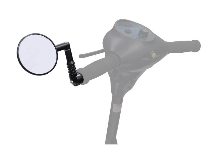This mirror easily mounts, folds up out of the way when you want it to, and is adjustable to any viewing angle. The round reflective portion measures 3″ across, and the arm will fit inside just about any handlebar grips with 13.75 mm to 22.5 mm (.54″ to .875″) inside diameter. Please note that this mirror assembly will not fit those scooters which use a wrap-around or delta type tiller.